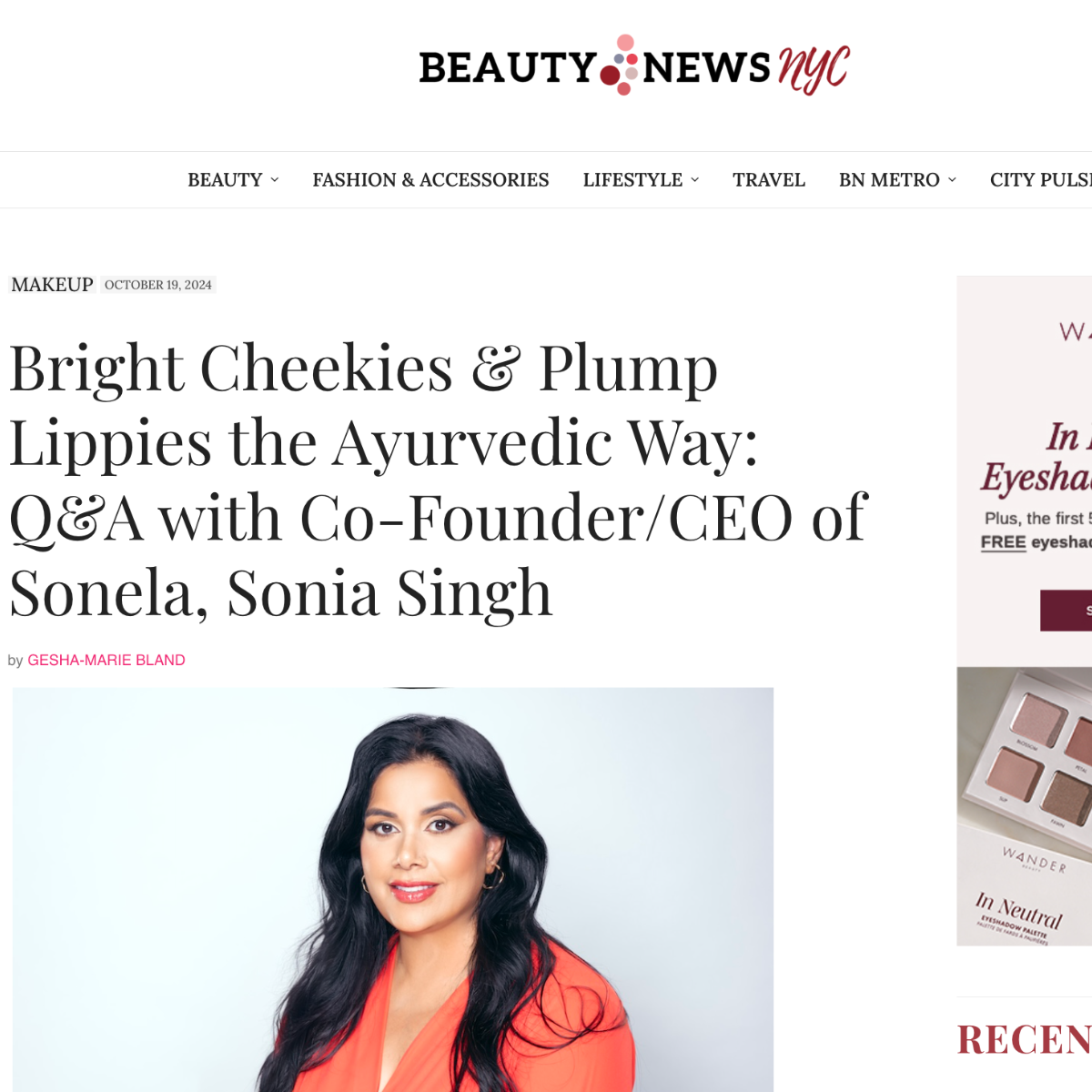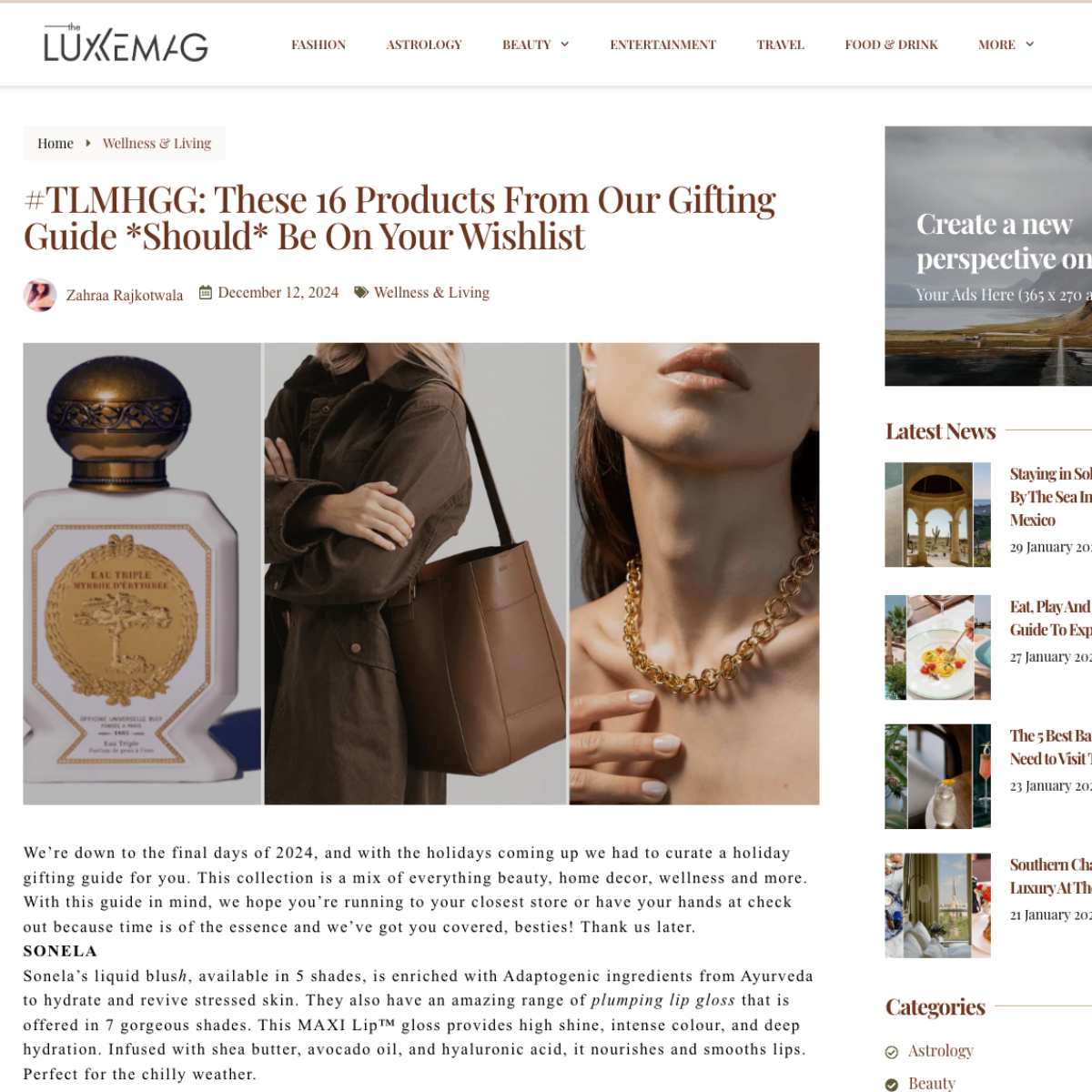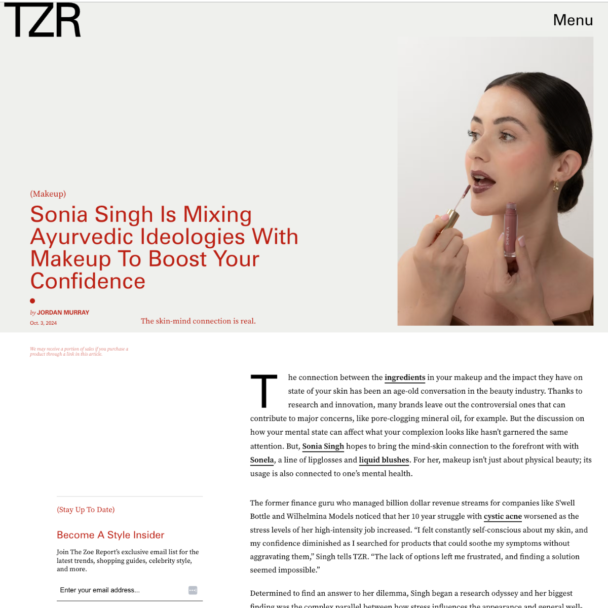"Sonela is a newly launched ayurvedic beauty brand. Its debut makeup collection features five liquid blushes and seven lip glosses formulated with adaptogenic ingredients."