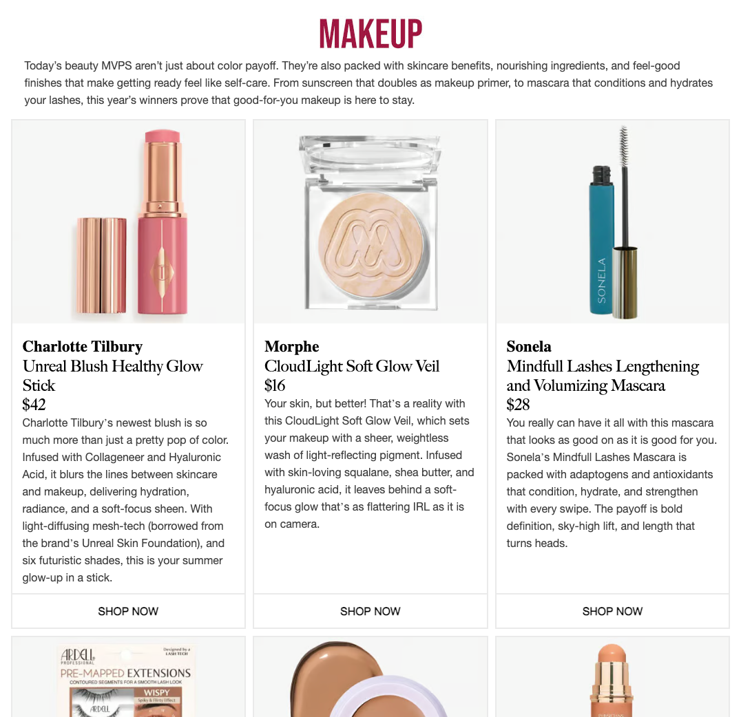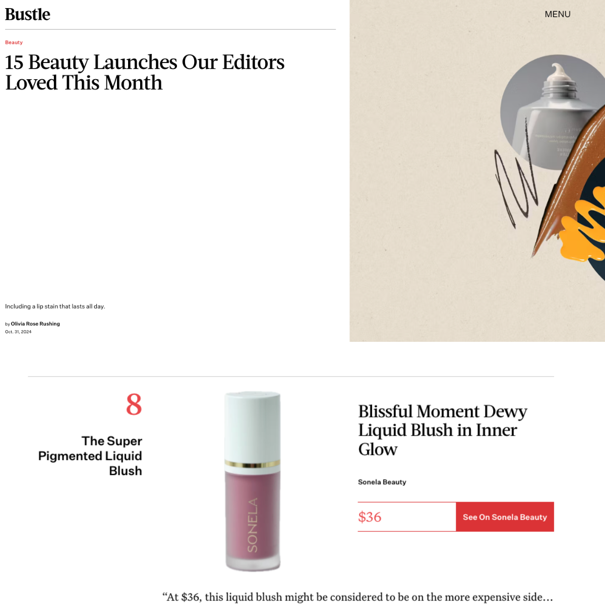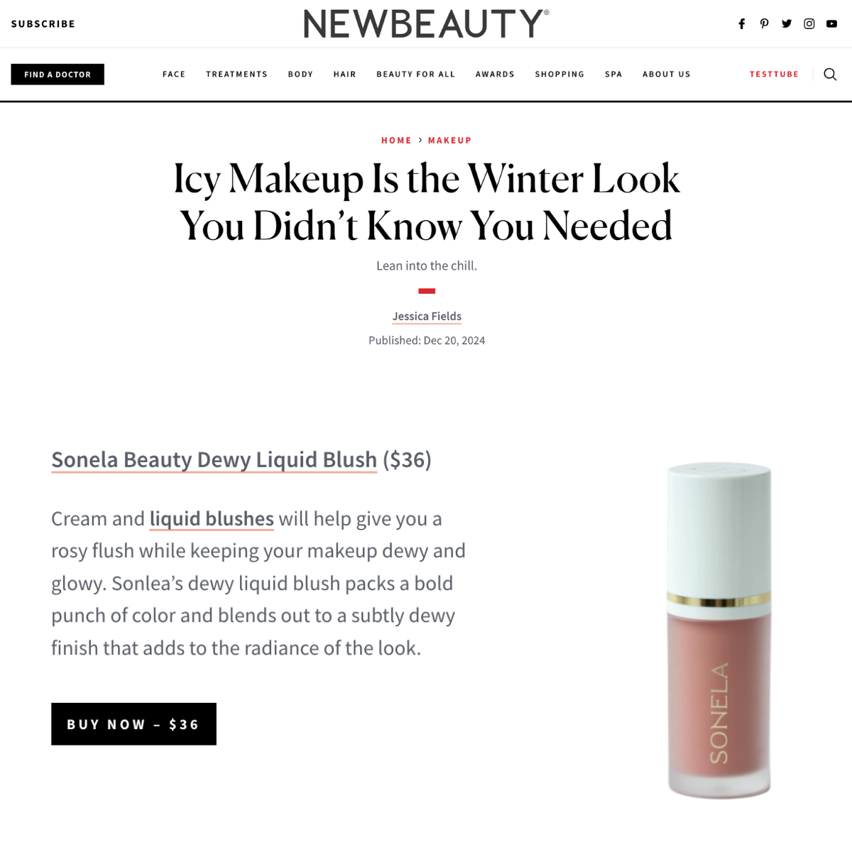 "As for as bold, inclusive, pigmented fluids that also serve up a dose of skin care-level formulation, recently launched Sonela has upped the ante with the first line of clean liquid blushes and plumping lip glosses infused with adaptogenic botanicals in compliance with Ayurvedic tenets around the mind-body, mood-beauty connection"